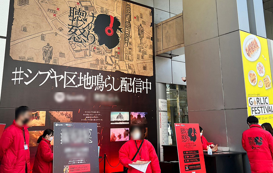 スクランブル交差点からも近く、通行量の多い公園通りに面したイベントスペース。背面に広告を掲出しながら、前で造作物の設置やサンプリングを実施することも可能です。
